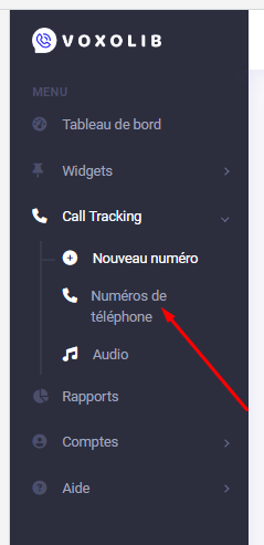 Une fois authentifié, sélectionnez le menu Call Tracking dans la barre latérale gauche et cliquez sur « Numéros de téléphone».
