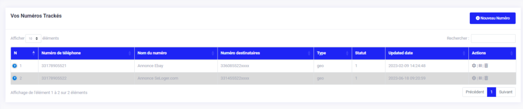 Votre écran va alors afficher la liste de tous vos numéros de téléphone Call Tracking que vous avez paramétrés sur votre compte.