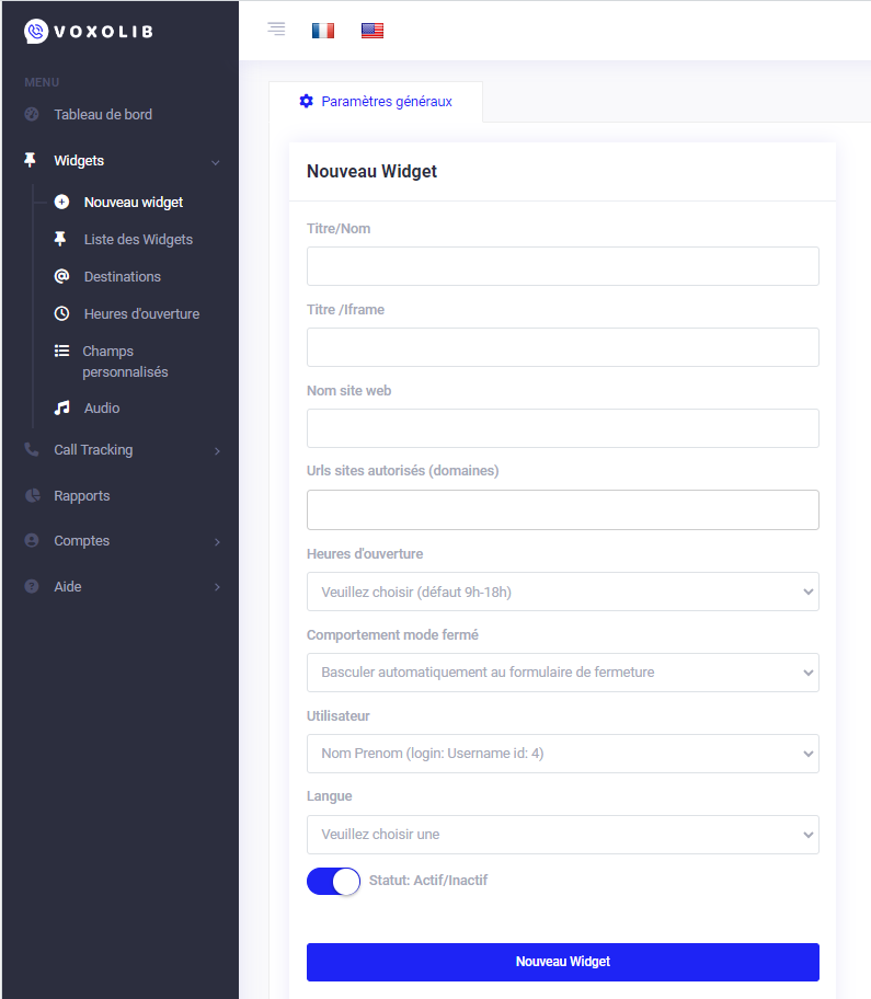 Une fois authentifié, sélectionnez le menu Widgets dans la barre latérale gauche et cliquez sur « Nouveau Widget».